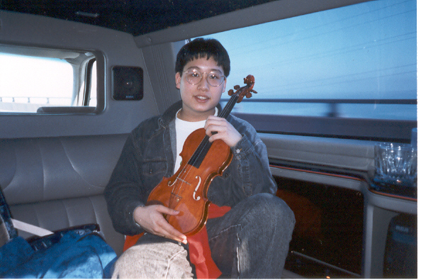 Jena's student days in Oxford 1997. I'm holding my violin by David Rubio made in 1997, which he made specially for me. It is a copy of the 'Vieuxtemps' Guarneri del Gesu. David started making these models after he had seen and heard the original violin at the Biddulph exhibition at the Metropolitan Museum in New York in 1994 when 25 violins by Guarneri 'del Gesu' where being displayed and played. He thought it sounded the best out of the lot with Paganini's 'Il Canon' second best for sound. I guess I'm just lucky to have it, and the sound carries all the way to the back of a concert hall, the e-string is very bright as well. When I went to see David to try the violin, I had a choice between a copy of the 'Rode' and the 'Vieuxtemps', and I fell in love with the later. It has a beautiful one-piece back with a very nice flame.