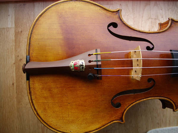 The crest on the tailpiece is of the Guarneri family and specially made in gold and enamel by a jeweller in New York. The original Lord Wilton Guarneri del Gesu had one on its tailpiece and can be seen in photos of Yehudi Menuhin holding or playing it.
