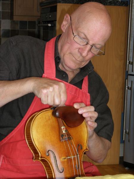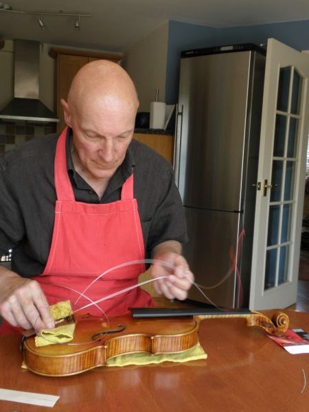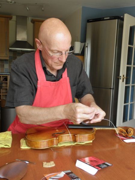 Glen threading the strings through the tailpiece of my violin