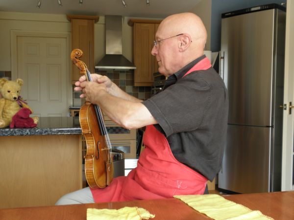 The violin is then varnished with Glen's secret varnish recipe with several coats being applied with a soft brush. The varnish has to be thick enough to protect the wood, but not so thick that it is allowed to cloak the sound