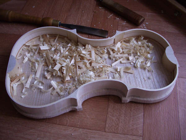 When the outside is finished, the back is turned over and hollowed with gounge and planes; the correct thicknesses here are essential if the violin is to sound well. All the surface finishes are done with a metal scraper.