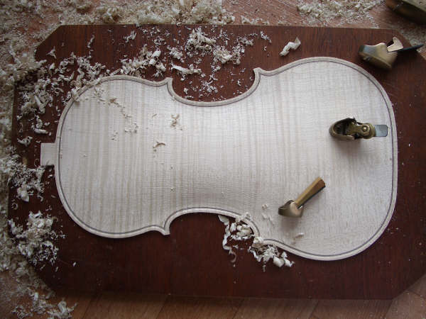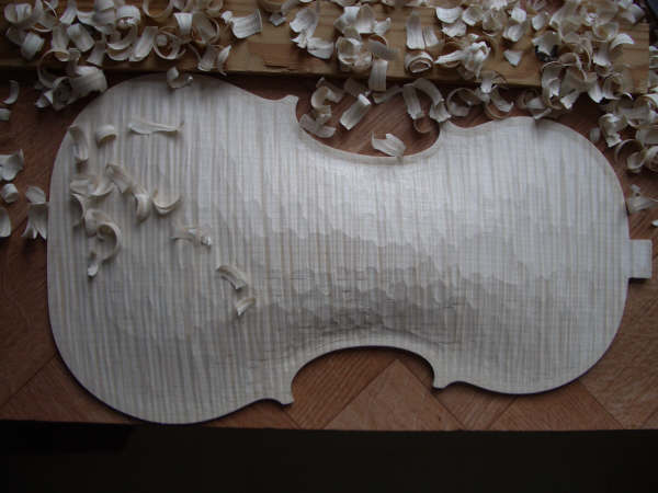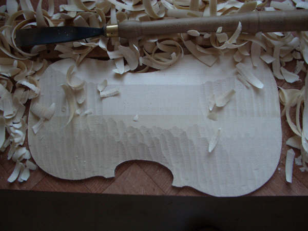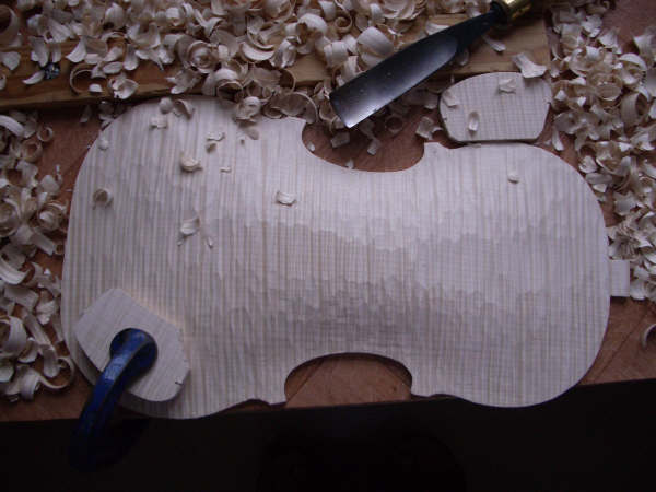 The back is cut to an outline and the outside arching is carved, first with a gouge then with small thumb planes: