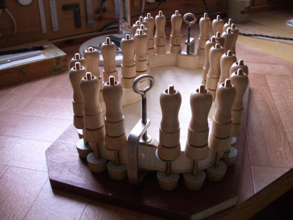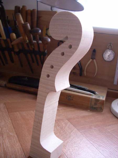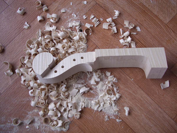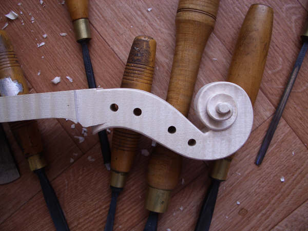 The scroll is cut from the block and with the waste wood removed, is then carved with hand tools (gouges, chiesels and scrapers) and the holes drilled for the pegs: