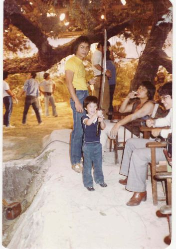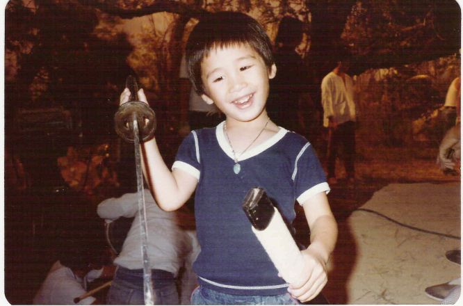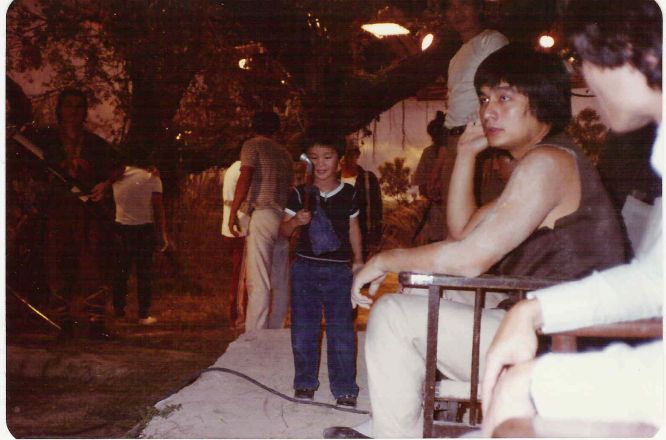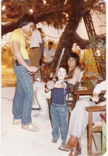 Me and Uncle Alex. These photos were taken at the movie studio. Myself, Mummy, Uncle Horatio (Uncle No.3) and Uncle David (Uncle No.10) went to watch him filming. Uncle Alex was a lot of fun, always joking around. Here he showed me how to smoke, I was trying to copy him smoking using the prop smoking pipe. Swords were being used in the fight scene, and in one photo I had just cut his knee when play acting with him (not literally) and he was goofing around pretending it was all painful and that he was hurt really bad. He was a lot of fun to be around, and I think some of his comedy movies show his true personality.In the last photo I'm sitting on the set with Uncle Horatio